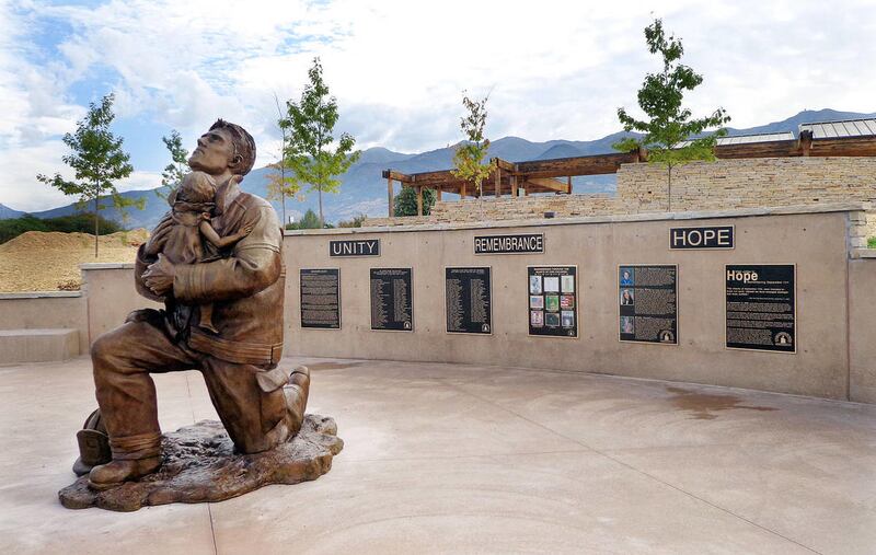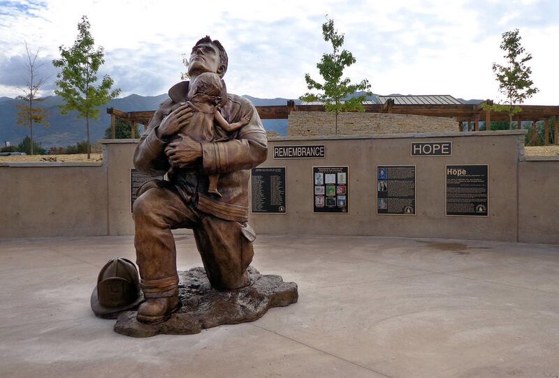 The memorial features a bronze statue of a firefighter holding a little girl and a series of five bronze plaques underneath the words “Unity,” “Remembrance” and “Hope.”