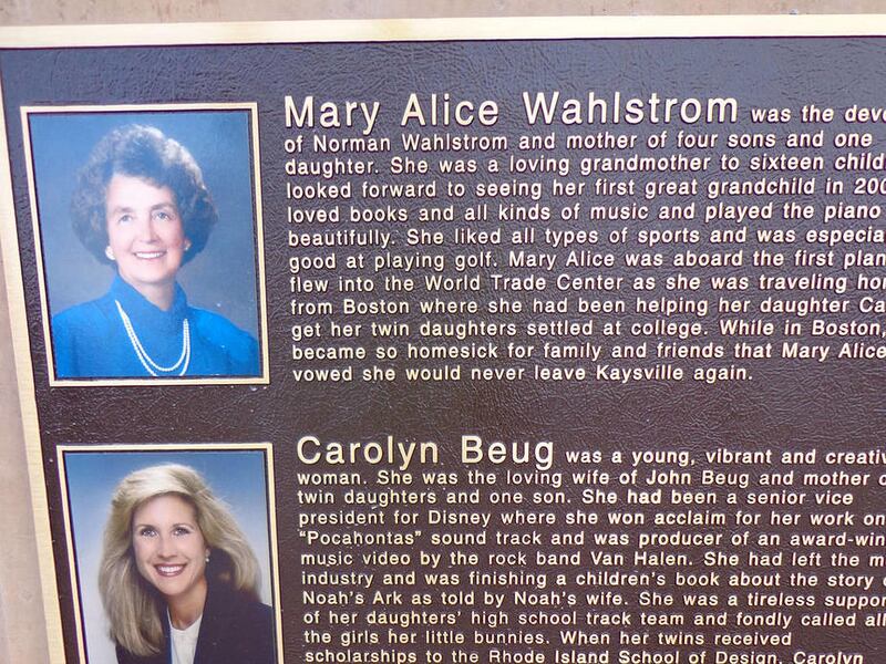 One of the plaques features her mother-in-law, Mary Alice Wahlstrom of Kaysville, and her sister-in-law, Carolyn Anne Beug, who were on American Airlines Flight 11 that crashed into the north tower of the World Trade Center.