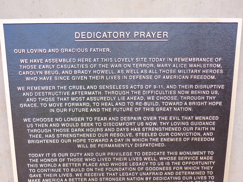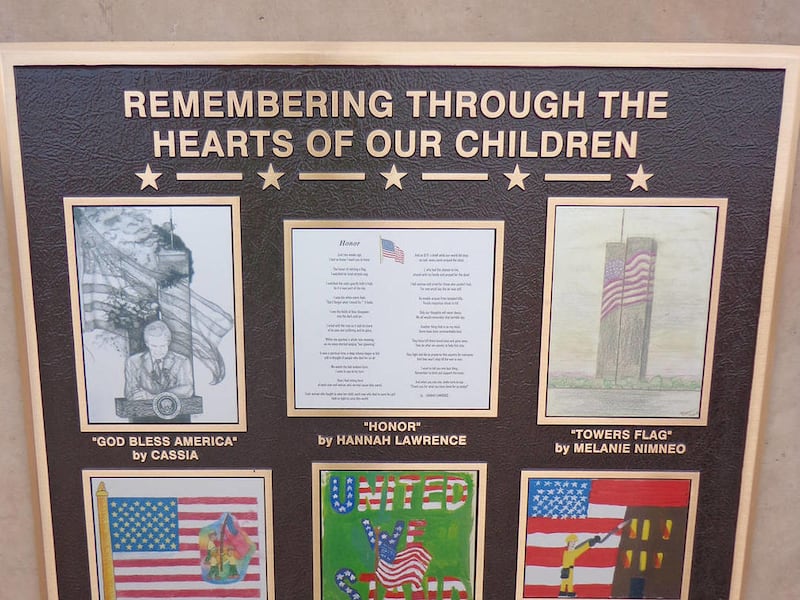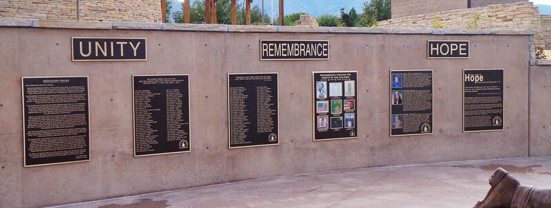 Other plaques have the names of 129 Utah military men and women who died fighting the War on Terror, children’s artwork about 9/11 and the dedicatory prayer given a year ago.