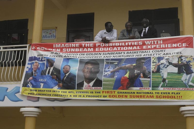 Draped across the front of the Golden Sunbeam School in Adenta is a giant banner that draws attention not just because it is striking, but also because it seems so out of place in this West African nation that reveres soccer players, not football players.