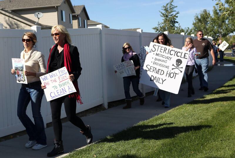 And with them she walked, joining the Saturday afternoon march that ended at Stericycle, the West's only remaining facility of its kind — an obscure nearly unmarked building flying the American flag amidst neighborhoods, an elementary school and churches.