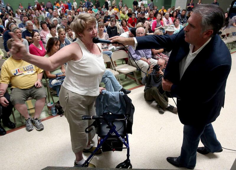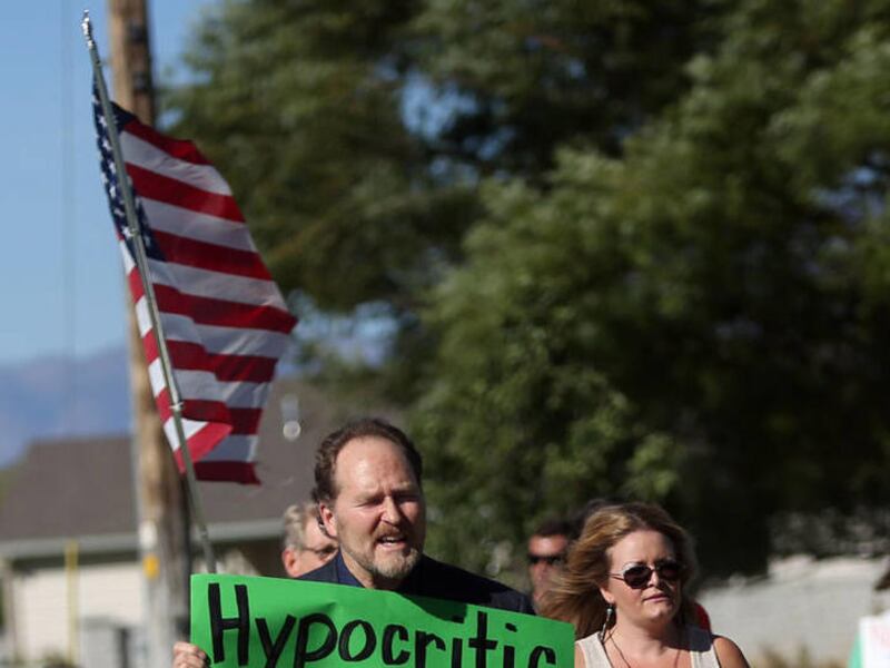 Bountiful residents Bill and Sharon Forbes were among the south Davis County residents who turned out for the event, sporting anti-Stericycle signs and demanding change.