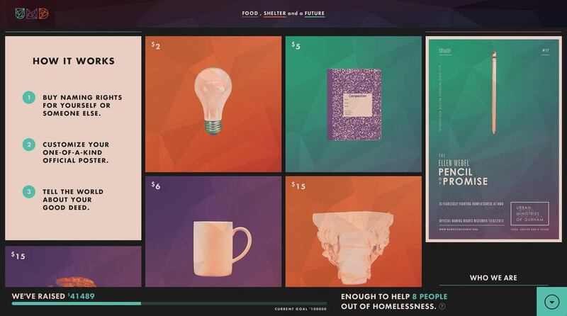 Through its Names for Change website, Urban Ministries of Durham decided to sell the naming rights to everything in its building — from walk-in freezers to toiletries. The site, designed by advertising firm McKinney, uses bold colors and sleek graphics to invite donors to choose from an apron to an oven, and from underwear to an interview outfit.