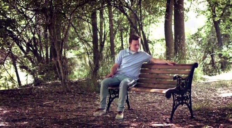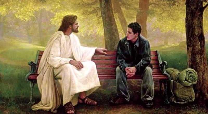 In the video, a painting by Greg Olsen is shown in which a teenage boy sits on a bench next to Jesus Christ. Olsen's son, Nate Olsen, then shares the story behind the painting, which involves a friend who took his own life.