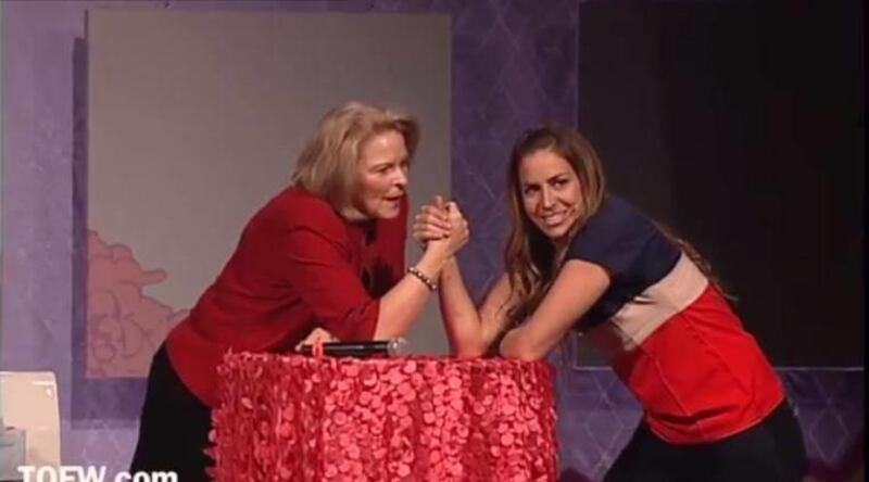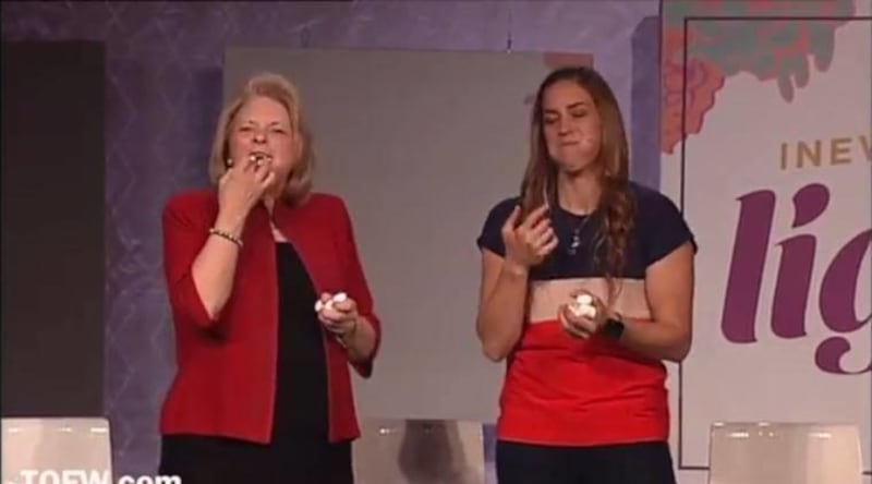 In a video posted on the Time Out for Women YouTube channel, Dew and Pikus-Pace compete in three "Minute to Win It" challenges. They pull out tissues, stuff marshmallows in their mouths, and then end the activity with arm wrestling.