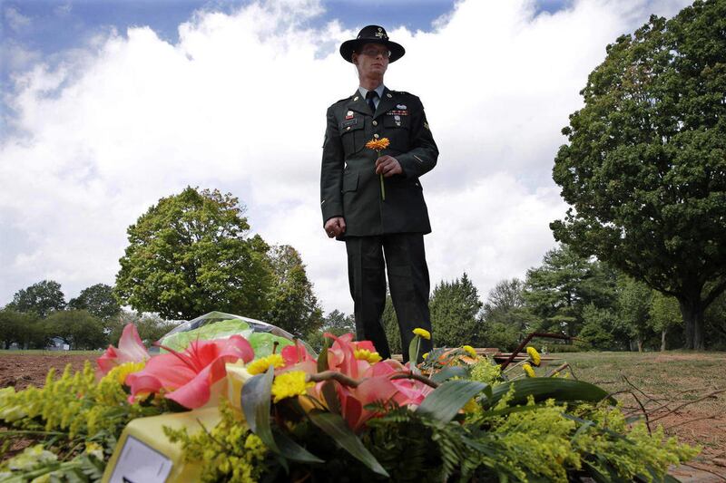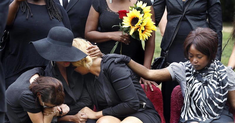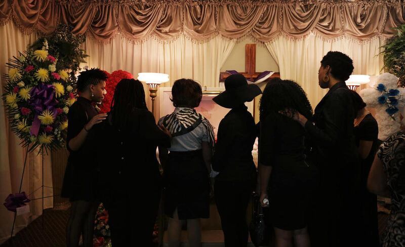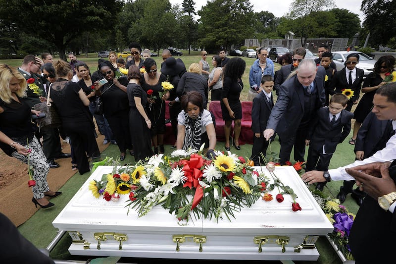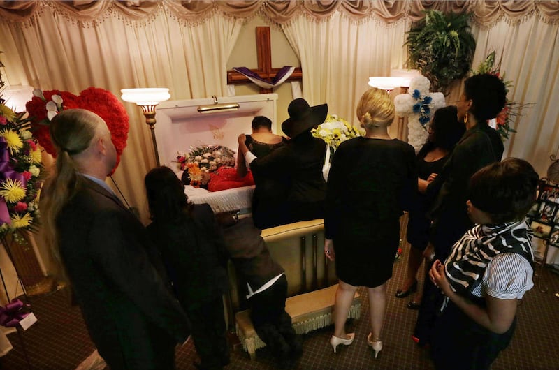 At the cemetery, mourners lay roses on her cream-colored casket.