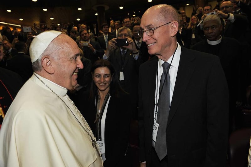 Pope Francis personally greeted many of those who will present at the three-day conference. President Henry B. Eyring of the First Presidency of The Church of Jesus Christ of Latter-day Saints sat on the front row of Synod Hall for the pope's address. As Pope Francis moved deliberately from presenter to presenter, he warmly greeted President Eyring, marking the first meeting between an LDS general authority and the pope at the Vatican.