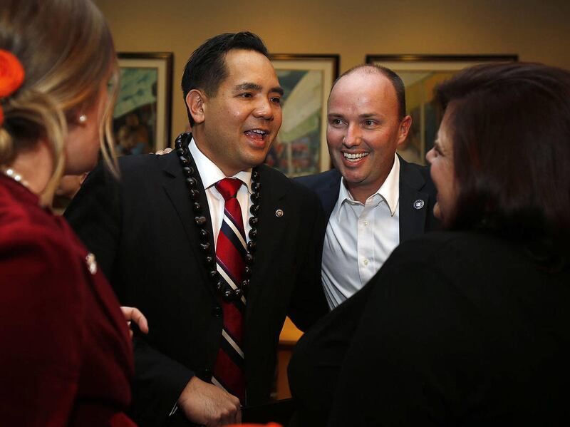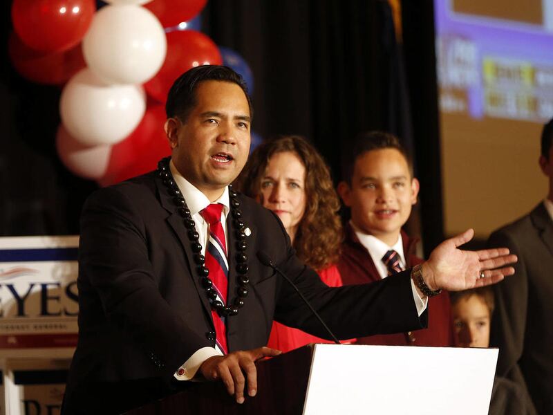 Wearing a kukui nut lei, Reyes accepted congratulations from a steady stream of well-wishers after his victory speech Tuesday.