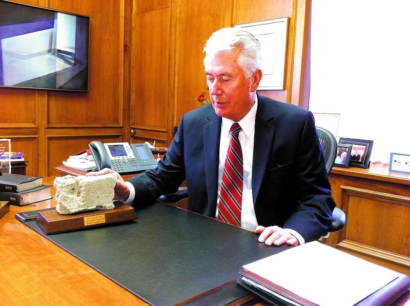 A piece of the Berlin Wall sits in President Uchtdorf's office, the work of a Mauerspecht, or "wall-pecker."