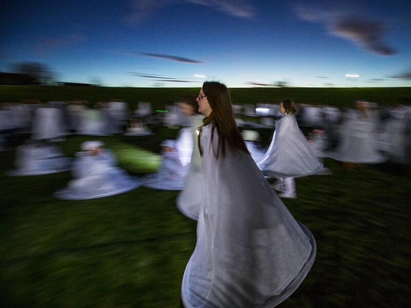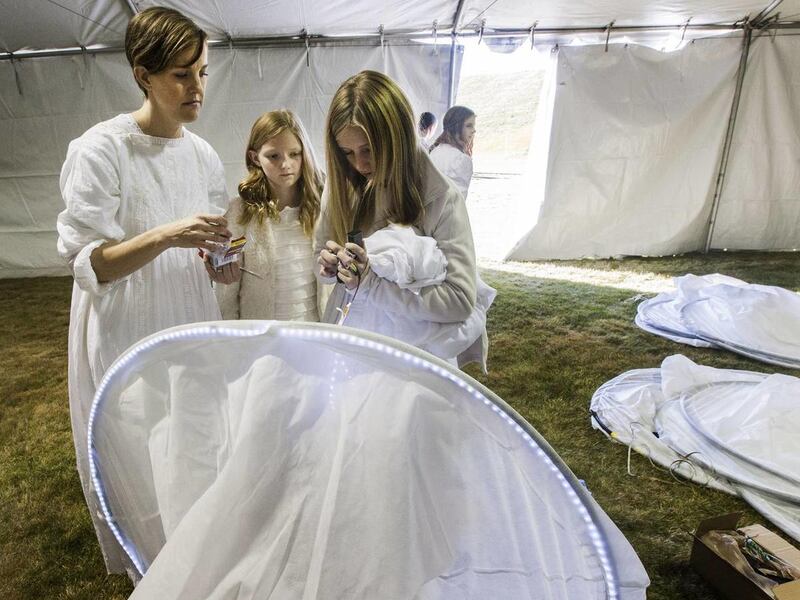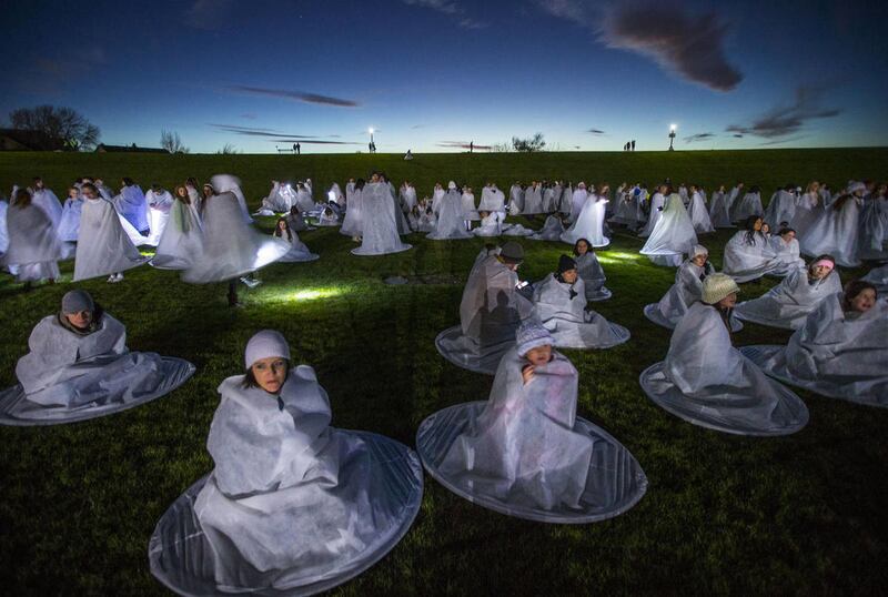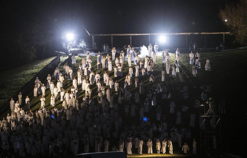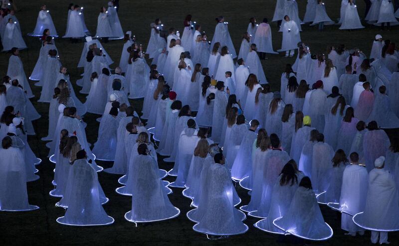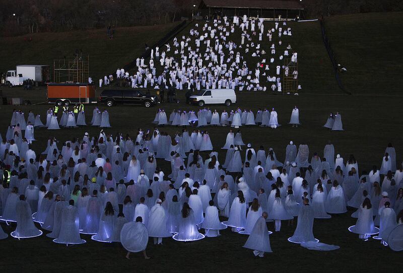 After gathering to be counted for the record, the volunteer angels stood as a backdrop while the Nativity was played out and filled in a grid painted on the grass to depict a Nativity when photographed from above.