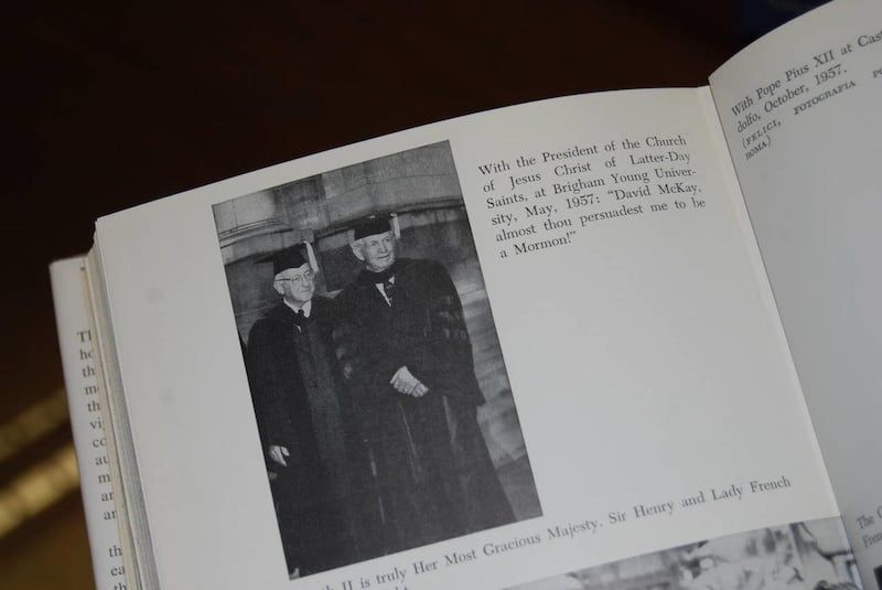 DeMille’s memoir was published posthumously, so the fact that the editor kept in his comments and a photo of the two men at the 1957 commencement is telling, D’Arc said. “I think it’s an indication of the editor’s knowledge of DeMille’s regard for President McKay,” the curator said.