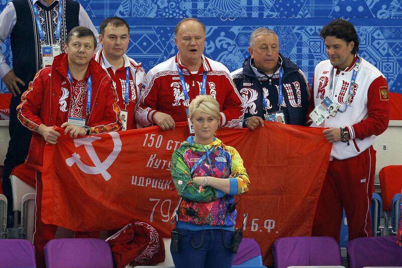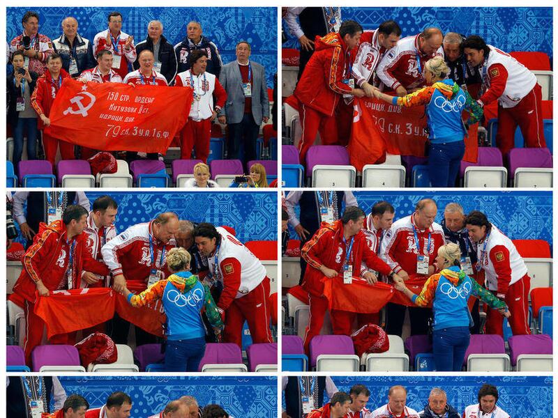 SOCHI, Russia — The head of Russia's Communist Party held up a hammer-and-sickle Soviet banner during a flower ceremony at the Winter Olympics, leading to a confrontation with staff over violating Olympic rules that bar political statements at the games.