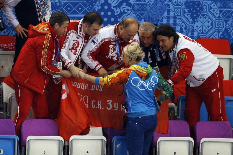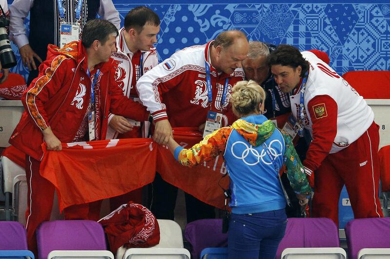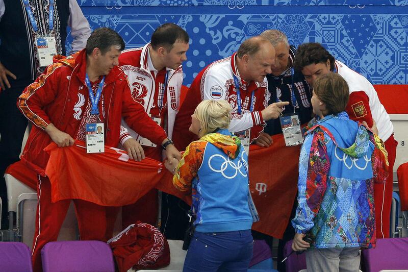 The men, including Russian lawmakers Nikolai Kharitonov and Yuri Afonin and Zyuganov spokesman Alexander Yushchenko, held the banner for about 10 minutes before a brief confrontation with arena staffers. It ended with the staffers standing in front of the banner to block its display and the venue manager, Russian speedskating gold medalist Svetlana Bazhanova, intervening and asking again that the banner be taken down.
