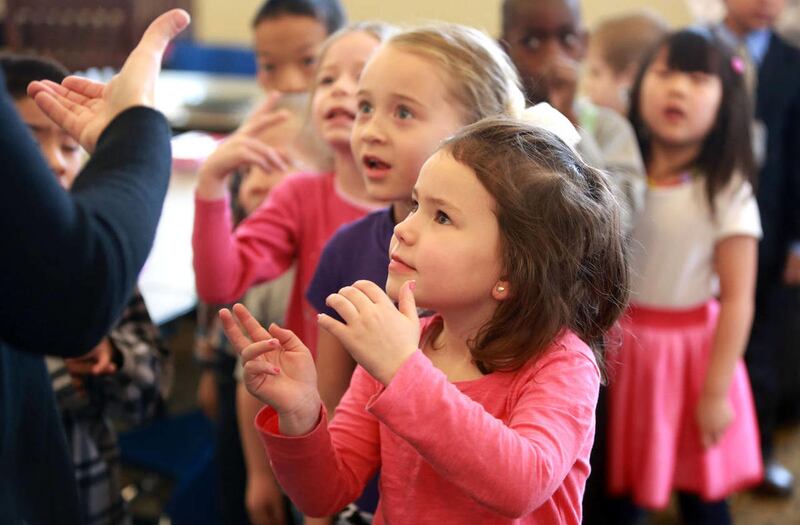 The deaf students watched intently as teacher Aimee Breinholt spoke to them using her hands. The entire class of all-day kindergarten is taught in American Sign Language, which gives the youngsters a leg up on their language skills. Many of them wear hearing aids or have cochlear implants, which help to amplify sounds but don't necessarily make up for the hearing loss.