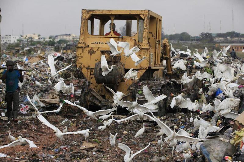 LAGOS, Nigeria — At Lagos' largest dump, dozens of men gather to sort iron, plastic and nylon atop a 20-foot wall of garbage where hundreds of white herons compete to eat the spoils.