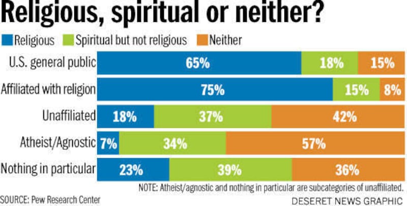 Pew Research Center data shows that nearly two-thirds of religiously unaffiliated Americans say they believe in God, 37 percent of them call themselves spiritual, and one-in-five (21 percent) report praying every day.