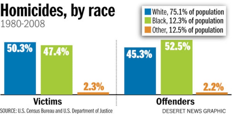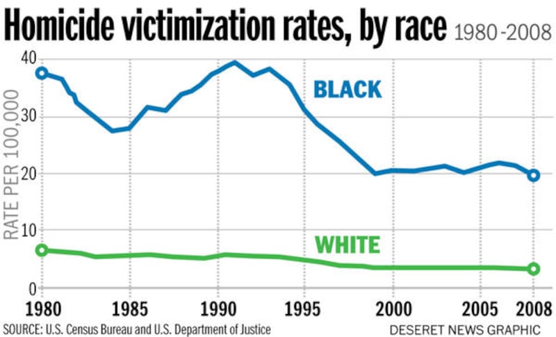 But the national murder rate misses the crux of the story. Homicide in America disproportionally involves young African-American males, both as victims and offenders, and the disparity is enormous. From 1980 to 2008, victimization rates for blacks were six times higher than for whites. Offending rates were eight times higher.