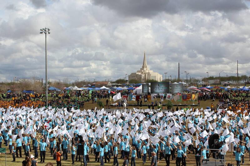 The temple serves an area with approximately 100,000 Mormons that encompasses most of the southeast portion of the Phoenix area. The youths were divided into six regions with about 2,000 teens each. In addition to the large group numbers, many youths sang solos, played instruments and danced in small group numbers.