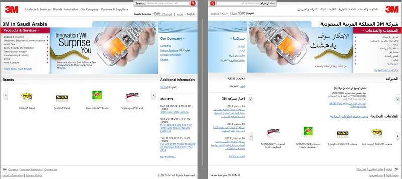 The antacid advertising example illustrates that not only words run from right to left but also timing, priority and other layout expectations, thus affecting the display of many elements beyond text. For example, when comparing the Arabic and English versions on Egypt’s website for the Ministry of Communications and Information Technology, users see the website reverses not only text direction and image order but also button order and even text motion for the scrolling headlines. A look at English and Arabic versions of 3M.com shows that layout of menus, search bars and sidebars also require mirroring or inversion of directionality.