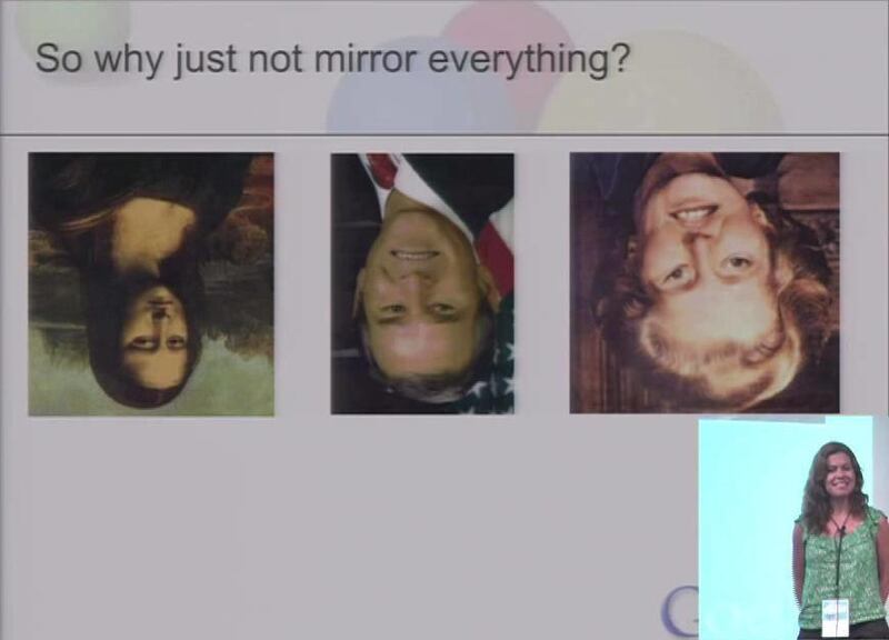 Without proper testing, even companies that intend to properly mirror websites, software and other products may not realize that they are doing it incorrectly. As illustrated very cleverly by Yana Margolin from Google’s Israel office in a presentation on “Automated Bidi Testing of Web Applications,” we who do not think from right to left cannot always detect when something is improperly mirrored. At a 2011 Google Test Automation Conference, and now on YouTube, Margolin displayed what initially appeared to be only upside-down images of the Mona Lisa, George W. Bush and Margaret Thatcher. However, upon further inspection, the Googler demonstrated that the audience was blind to what should have been obvious flaws simply because the people were not familiar with that change in perspective. The flaws became readily apparent only once the images were viewed in the traditional upright perspective.