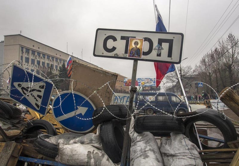 Tensions were still high Thursday in Donetsk, with about 1,000 protesters standing outside the occupied building chanting "Russia! Russia!" Activists were reinforcing lines of barricades, piling up rubber tires or building brick walls out of cobblestones.