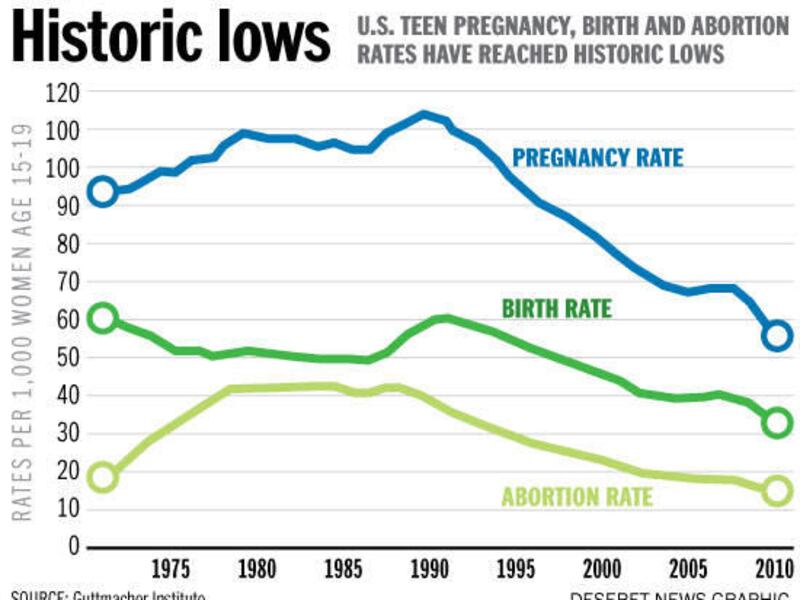 The report by the Guttmacher Institute looks at 2010, the most recent year for which numbers are available. It says that there were 614,000 pregnancies among teenage females 15-19, or 57.4 per 1,000. That's a 51 percent drop from the 1990 peak and a 15 percent decline from 2008.