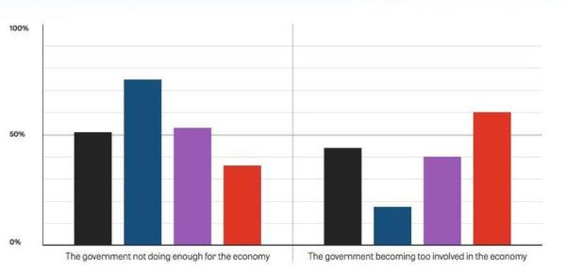 Fifty-three percent of moderate responders answered that they were more concerned with the government not doing enough for the economy, compared to only 40 percent who were worried about too much government involvement.