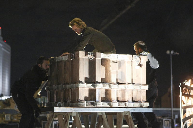 Each locked in a wooden crate, the racers had to use their ring of 50 keys from their box and find the one to free their hands and feet, and then get the lock picks from outside the crate and pick the front lock before the crate was lit on fire and dropped. Their team member watched from a monitor.