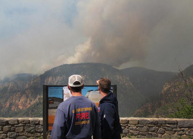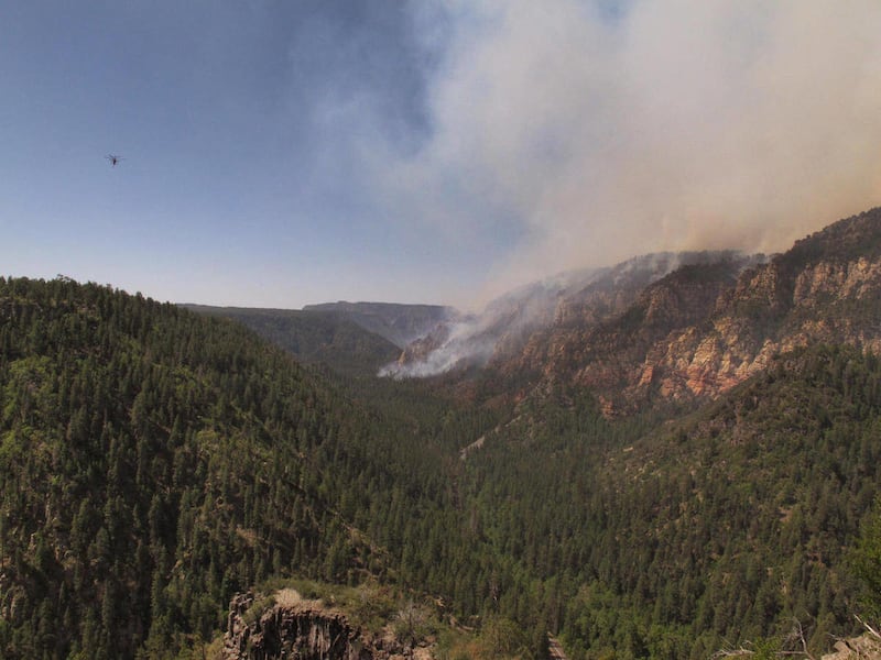 OAK CREEK CANYON, Ariz. — A wind-whipped wildfire burning in a rugged canyon between Sedona and Flagstaff now is estimated at 850 acres and growing.