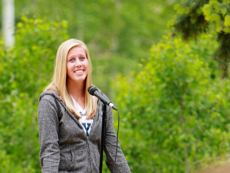 Ashley Garfield, a member of the women’s basketball team, told how athletes improve their ability to compete by improving their strength. Greater physical strength, she said, comes by increasing resistance. She then opened the scriptures to show the young women how the Lord uses the same principle of resistance in the form of challenges and trials to strengthen faith.
