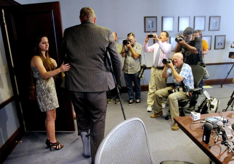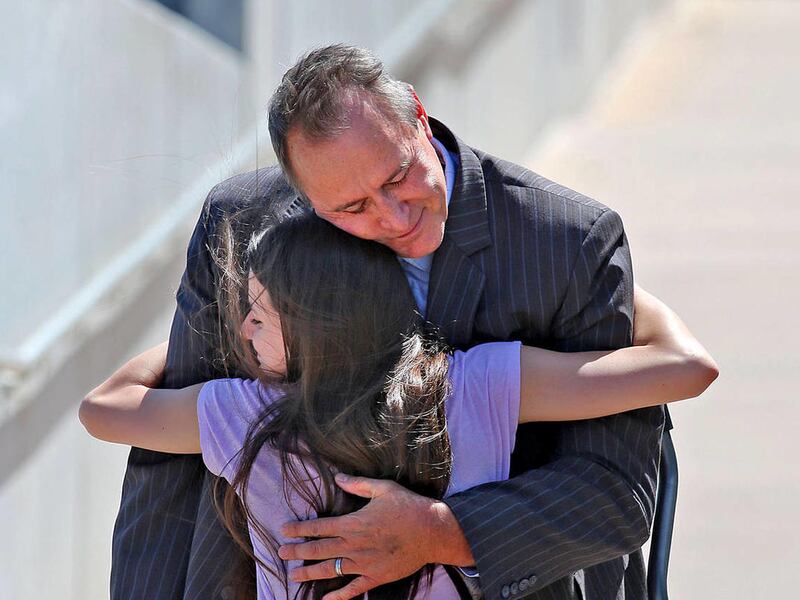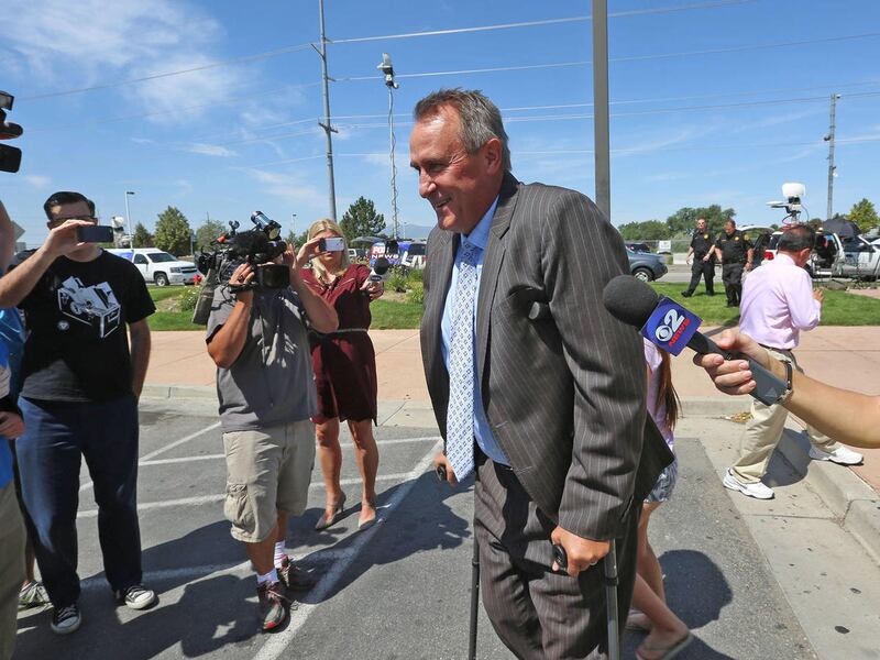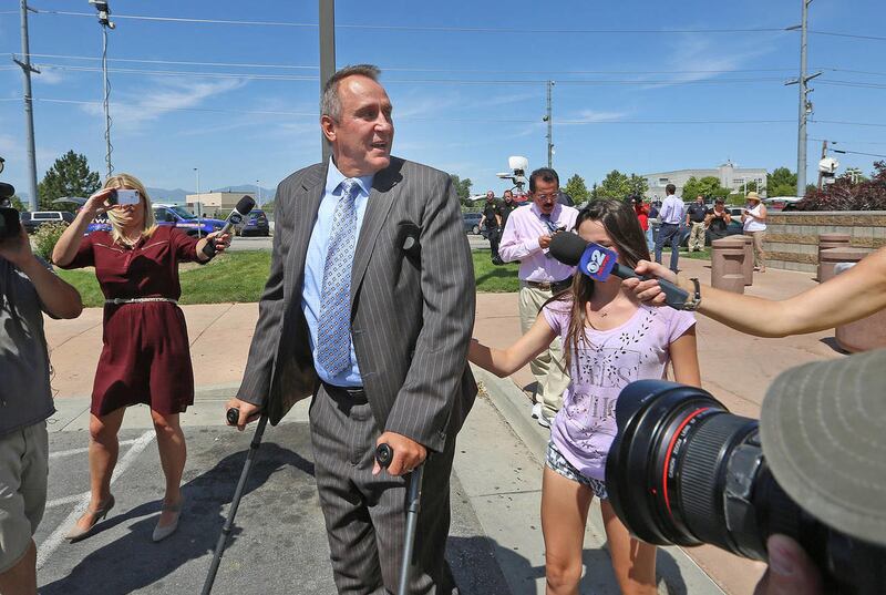 Shurtleff walked out of the jail on crutches and wearing a boot cast on his left leg about 11:45 a.m. His teenage daughter ran up to hug him before they got into a vehicle and drove away.
