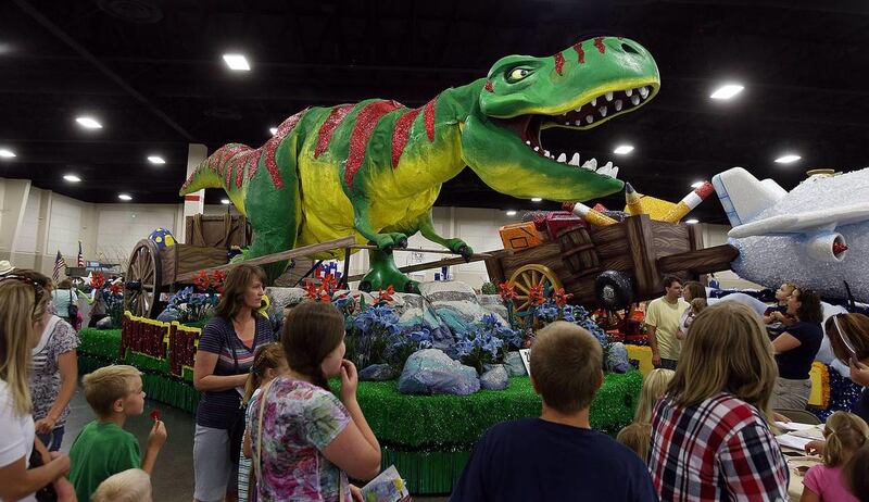 It took more than three cars to get Matsumori, her relatives and 14 children to the exhibition hall Monday. She said her family's favorite float featured a more than 8-foot tall, green and red-dotted Tyrannosaurus rex.