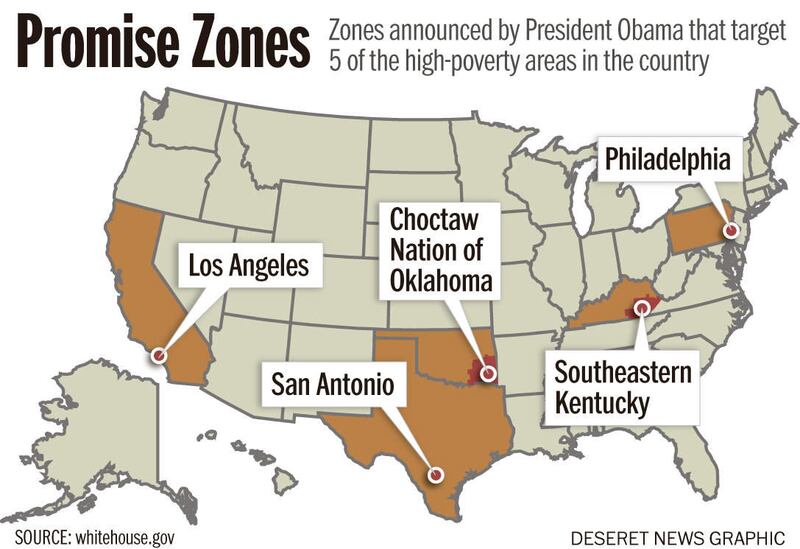 The Promise Zone initiative doesn't have any dollar amount tacked to it, or award funding to chosen communities. Instead, it's an initiative to get things going at a grassroots level, Smallwood says. Of the 20 forthcoming Promise Zones, Obama has announced the location of five: Philadelphia, San Antonio, Los Angeles, Southeastern Kentucky and the Choctaw Nation. In Philadelphia, officials are using the designation to partner with a local college to provide job training. And in San Antonio, officials hope improving street lighting and demolishing abandoned buildings will boost public safety.