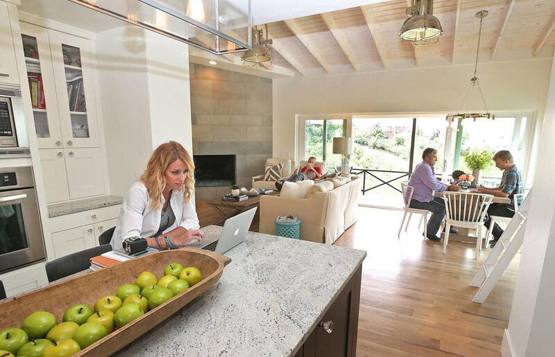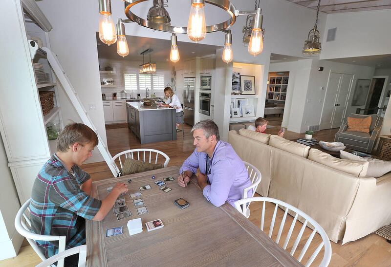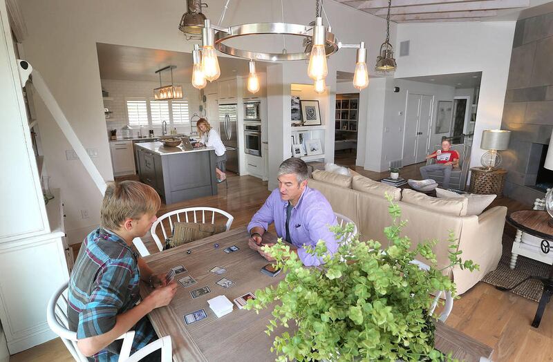Most of the way across the continent in Bountiful, Utah, Tonya and Jeff Olsen enjoy family time in the 1960 rambler they renovated with such closeness in mind. He’s watching TV while she reads a few feet away. Zach, 15, and Aiden, 13, are there, as well, playing on their phones.