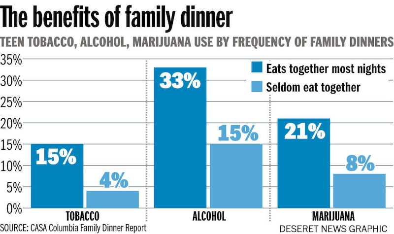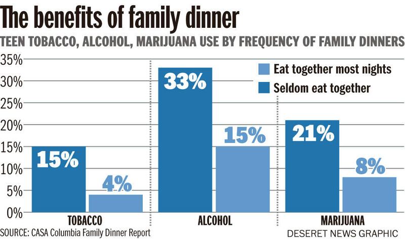 Research says meals together are an important part of healthy adolescence. Children in families that eat dinner together most nights are significantly less likely to use illegal drugs, smoke or abuse alcohol. And kids who make it to 21 without using those substances probably never will, says research from the National Center of Addiction and Substance Abuse at Columbia University.