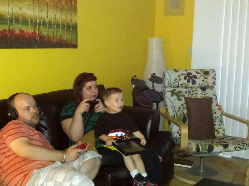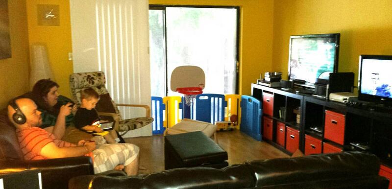 Gina Tentzeras and her husband, Chris, sit beside each other on the couch, facing twin TV sets on the credenza, their young son between them playing a puzzle game on his iPad. They’ve outfitted this family space in their Fort Lauderdale, Florida, home for a togetherness they enjoy passionately: video games.