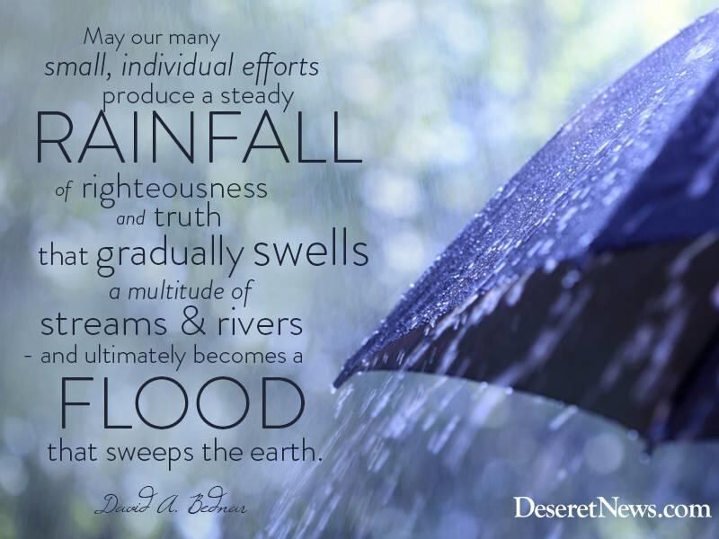 “Try to imagine the impact we can have as hundreds of thousands and millions of members of the Lord’s restored church contribute in seemingly small ways to the rising floodwaters. May our many small, individual efforts produce a steady rainfall of righteousness and truth that gradually swells a multitude of streams and rivers —and ultimately becomes a flood that sweeps the earth.”