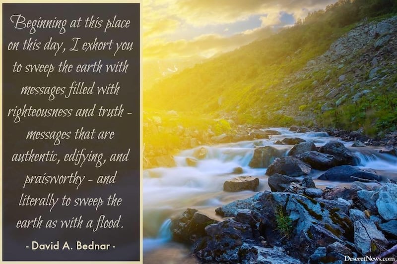 “What has been accomplished thus far in this dispensation communicating gospel messages through social media channels is a good beginning — but only a small trickle,” said Elder Bednar of the Quorum of the Twelve Apostles during BYU Education Week on Tuesday. “I now extend to you the invitation to help transform the trickle into a flood. Beginning at this place on this day, I exhort you to sweep the earth with messages filled with righteousness and truth — messages that are authentic, edifying, and praiseworthy — and literally to sweep the earth as with a flood.”