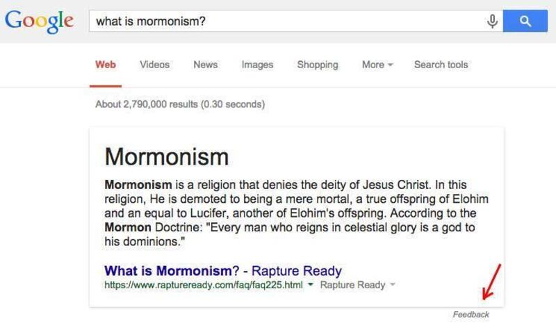 When users typed the question, "What is Mormonism?" into the Google search engine, the answer displayed prominently at the top of the results page referred to a definition from Raptureready.com: