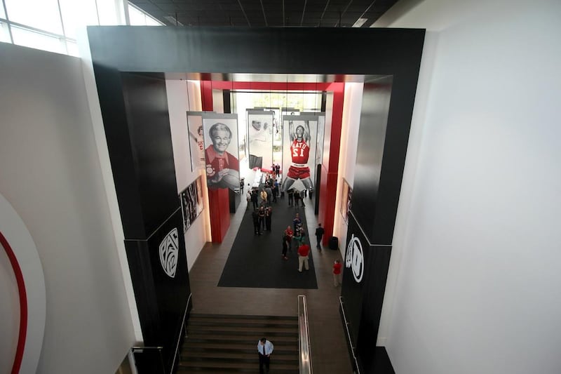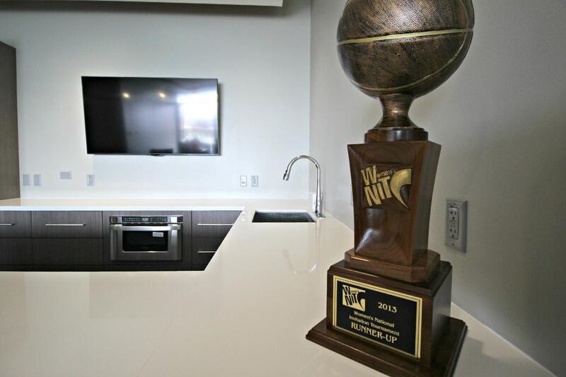 The $36 million complex has five floors, including two 12,000 square foot practice gyms, state of the art equipment, lounges and basketball offices for both the men's and women's basketball teams.