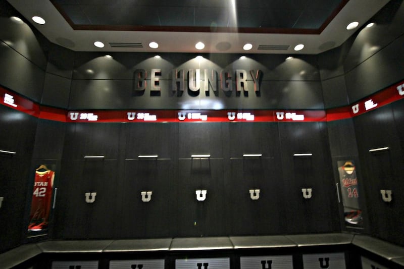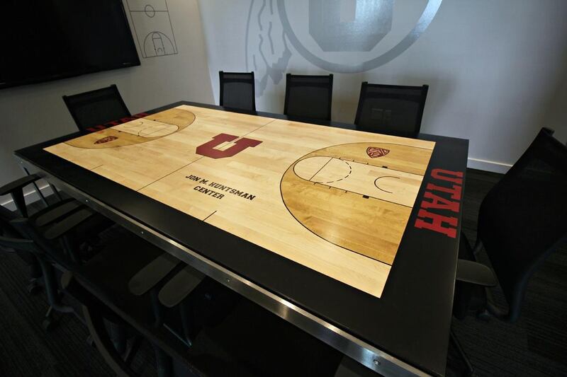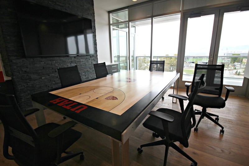 Men’s head coach Larry Krystkowiak, whose office is on the fourth floor, and women’s head coach Lynne Roberts each have an office that overlooks the campus and the Salt Lake valley. Both are 935 square feet and are designed in similar fashion and each include a fireplace, a 60-inch television screen and a private bathroom with shower.