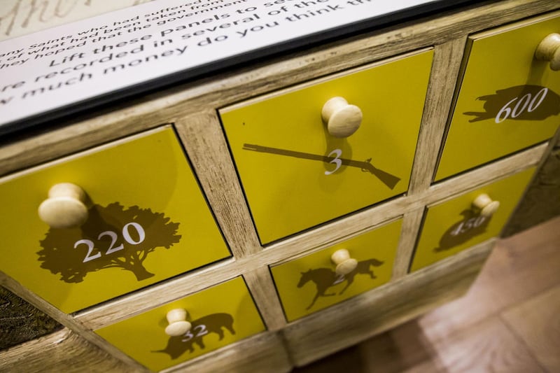 Each display features a variety of artifacts, letters and documents as well as some interactive kiosks or videos.