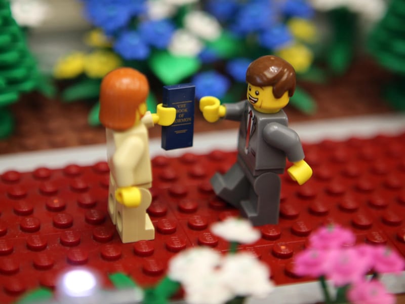 One display in the exhibit features LDS scenes provided by a non-LDS company, Citizen Brick. Based in Chicago, this company specializes in custom printing Lego items. Viewers can see missionary Lego mini-figures holding copies of the Book of Mormon in a scene titled “The District Meeting.” Viewers also might recognize the setting for “The First Discussion,” taken from the Lego set for the television show “The Big Bang Theory.”
