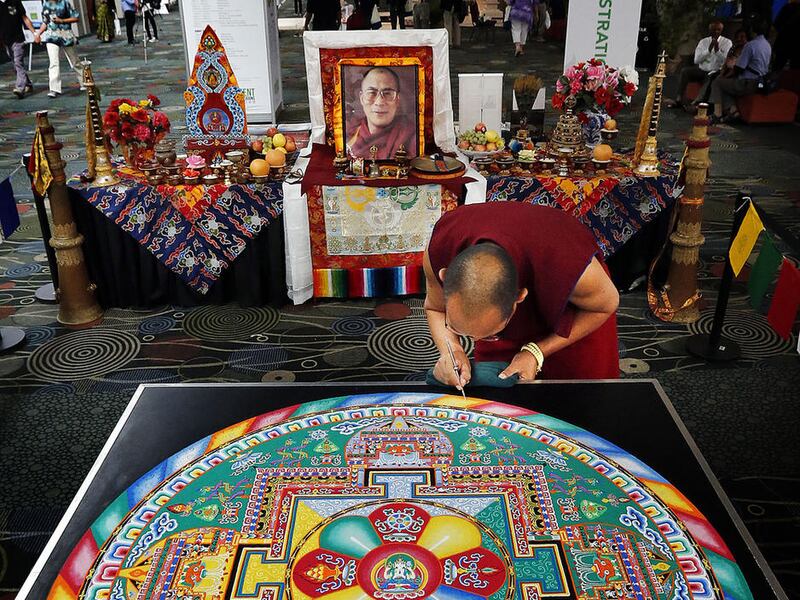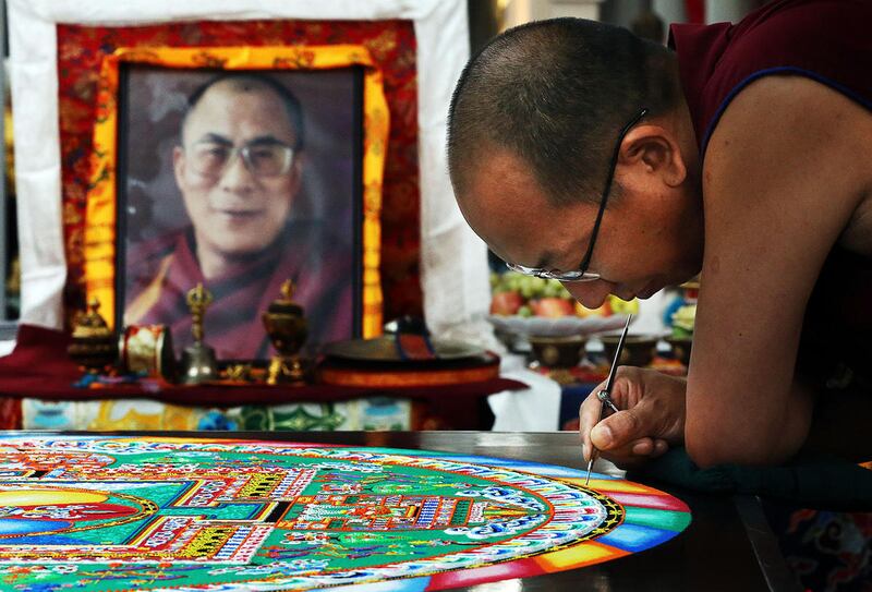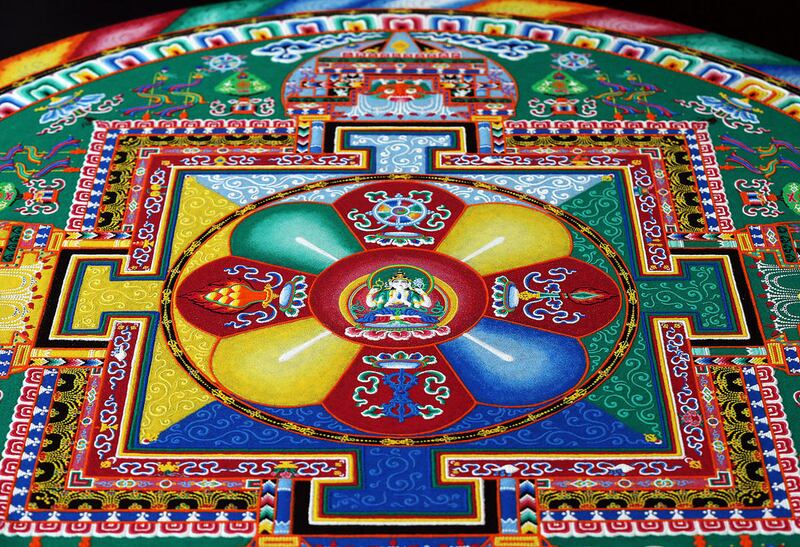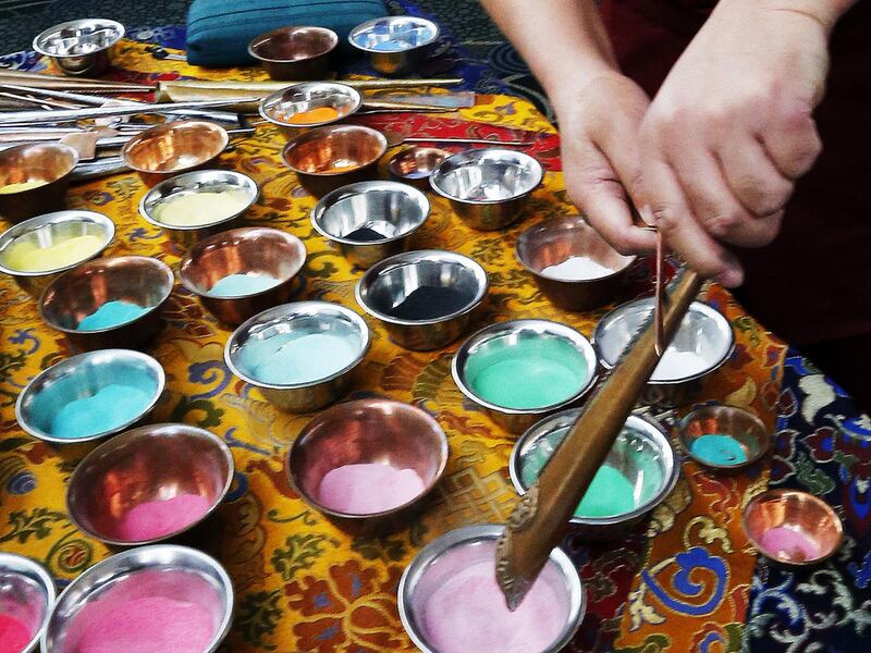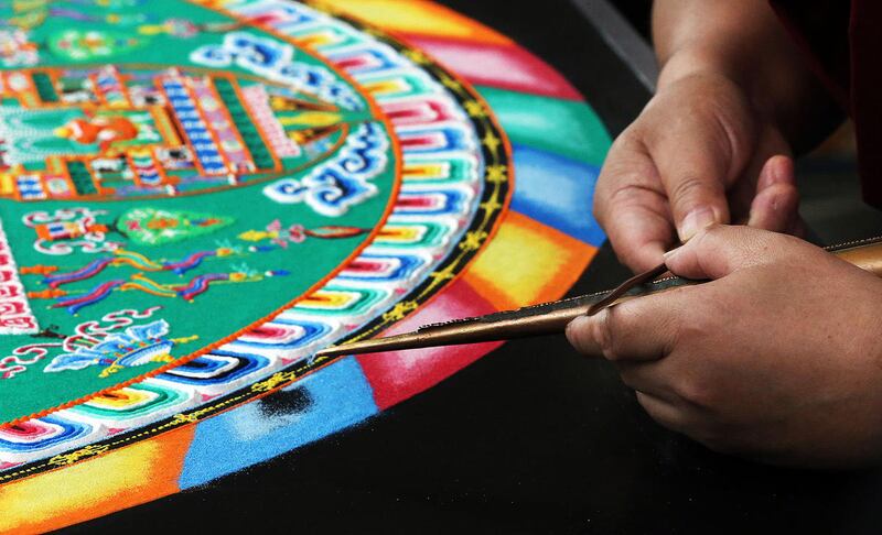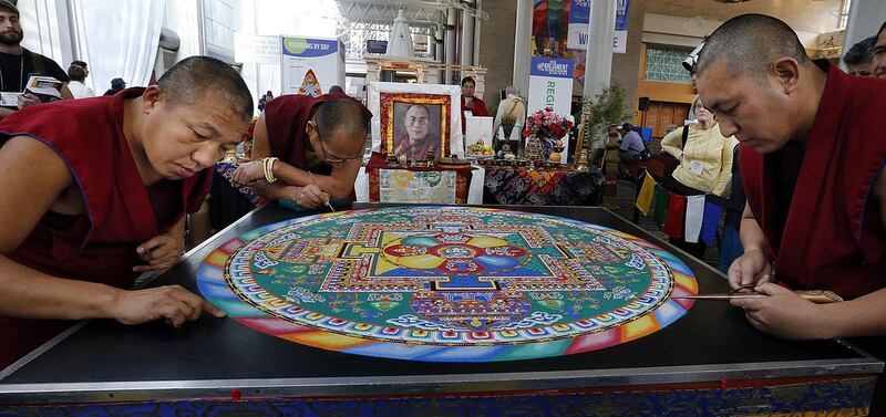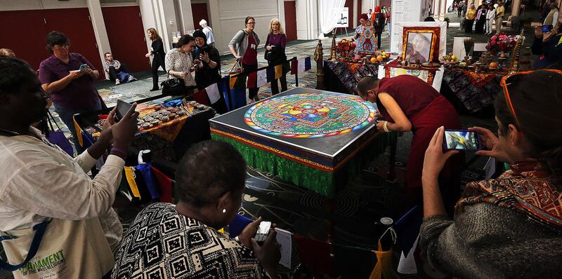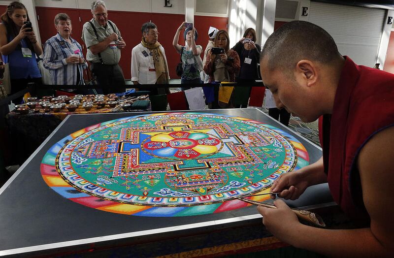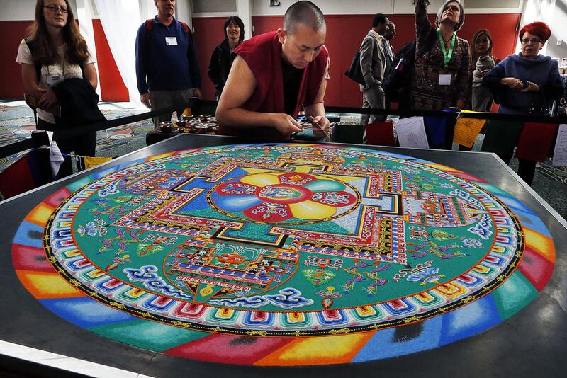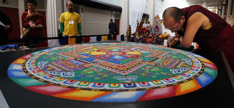 Earlier Monday, Tibetan Buddhist monks from the Drepung Loseling Monastery put the final touches on an intricate mandala sand painting they had assembled throughout the event.