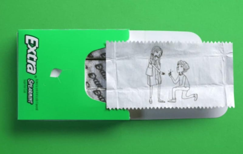 The video begins with the couple's first meeting and ends with Juan's marriage proposal. Extra gum plays a role in unwrapping their story and bringing them together.