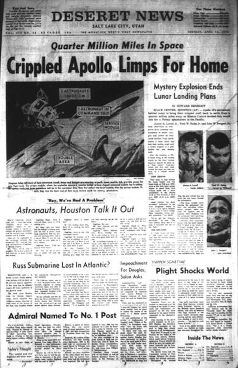 This April 14, 1970, Deseret News focuses on the Apollo 13 spacecraft, which was rocked by an explosion in space, leading astronauts James Lovell Jr., Fred Haise and John “Jack” Swigert to abandon their trip to the moon and fight instead to return home in their crippled ship.