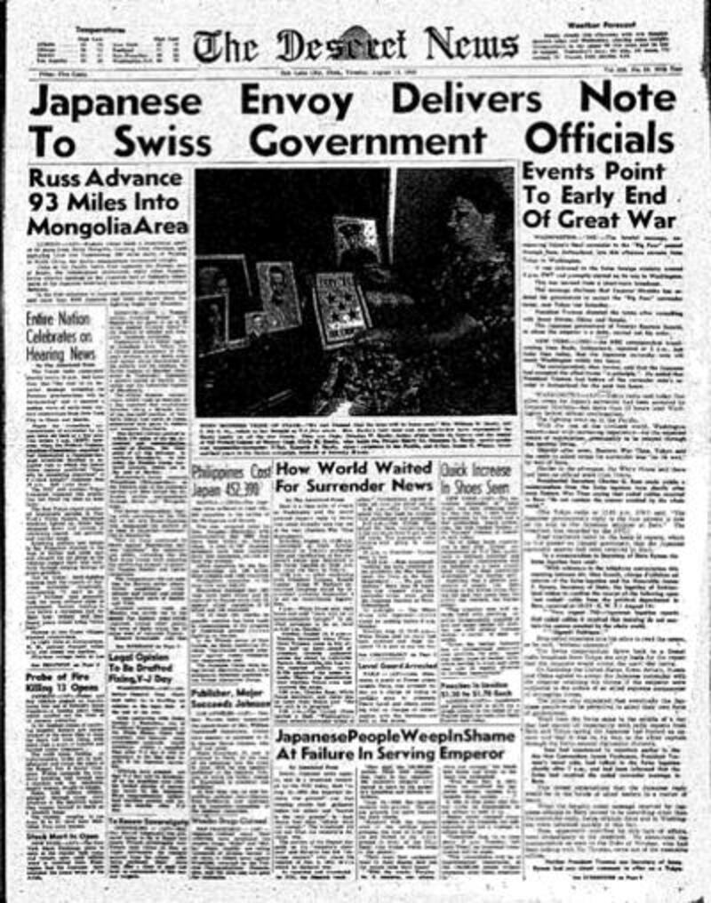 As this edition of the Deseret News reported, “Tokyo radio said today that allied terms for Japan’s surrender had been accepted by Emperor Hirohito — but more than 12 hours later Washington lacked official confirmation.