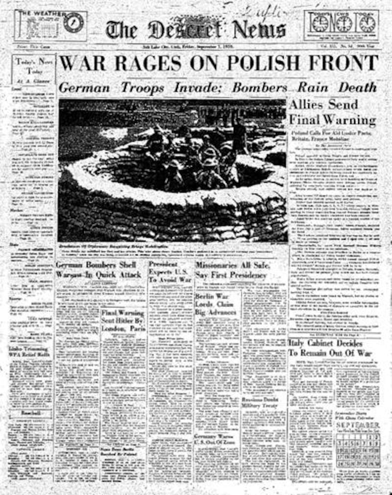 On September 1, 1939, Germany invaded Poland, as seen in this Deseret News front page from that date. The event officially pulled France and Great Britain into the war two days later when those countries declared war against Germany.