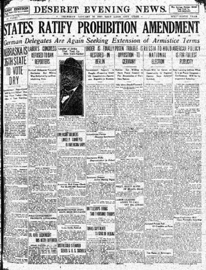 A front-page story under the headline, “National prohibition goes into effect,” informed Deseret News readers that the ban on liquor would go into effect at midnight and did not include loopholes — if you imbibed alcoholic drinks, you would be penalized.