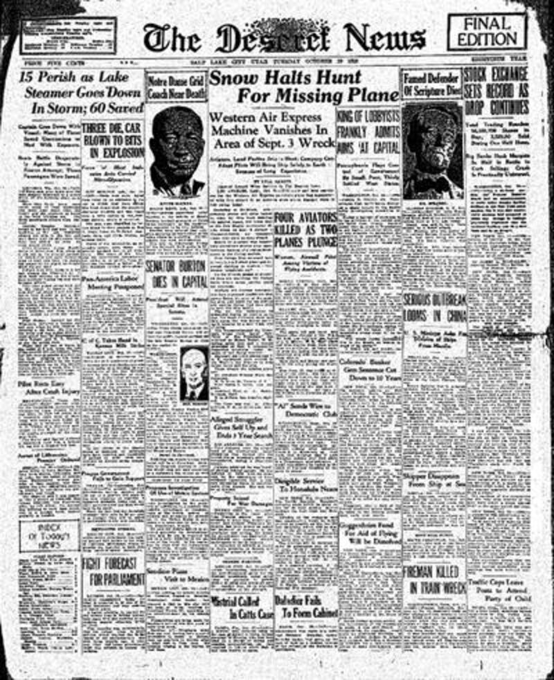 The story in the Deseret News was titled, “Stock exchange sets record as drop continues,” and proclaimed that the “crash is practically universal.”